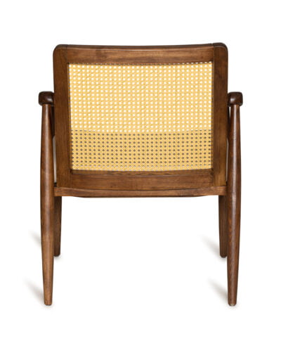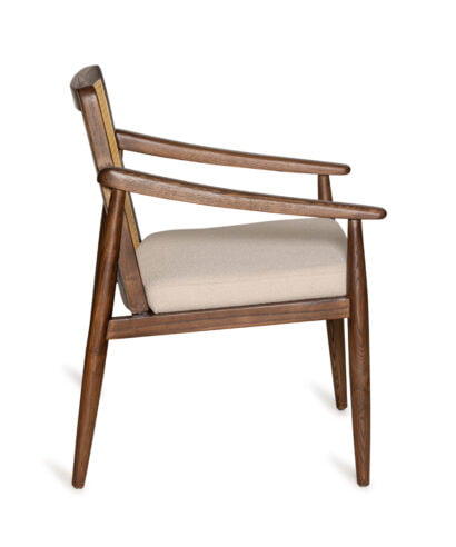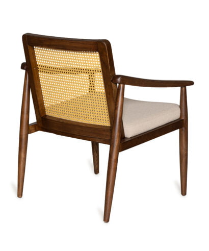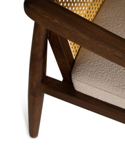 כורסא קלאסית בשילוב עץ מלא, גב ראטן ומושב בד אפור בהיר.
