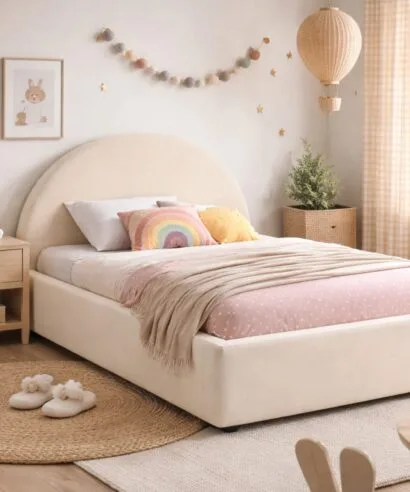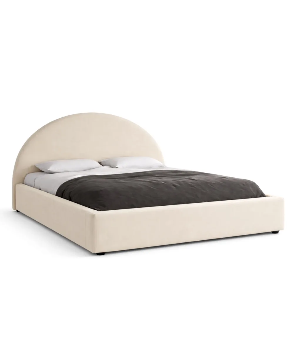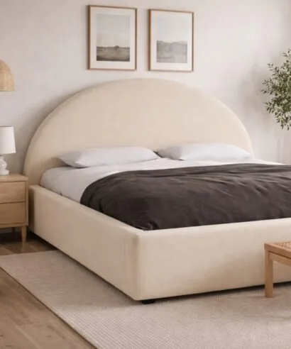 מיטה מרופדת בקווים נקיים ומינימליסטיים, בעלת ראש מיטה עגול ורחב המעניק תחושת עומק ורכות לחלל השינה. הריפוד עשוי בד איכותי במרקם חלק ונעים למגע, בגוון שמנת טבעי המשתלב בקלות עם כל סגנון עיצוב — סקנדינבי, מודרני או קלאסי.