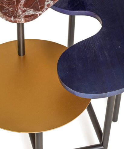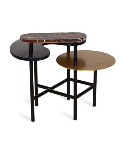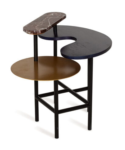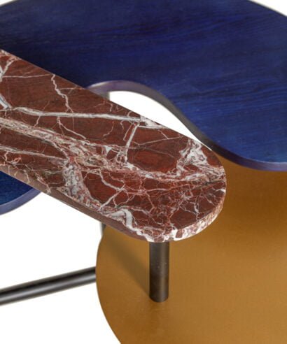 יצירת אומנות בשילוב חומרי גלם מן הטבע, שיש חום בשילוב עץ בגוון כחול כהה ופלטת מטאל בצבע brass.