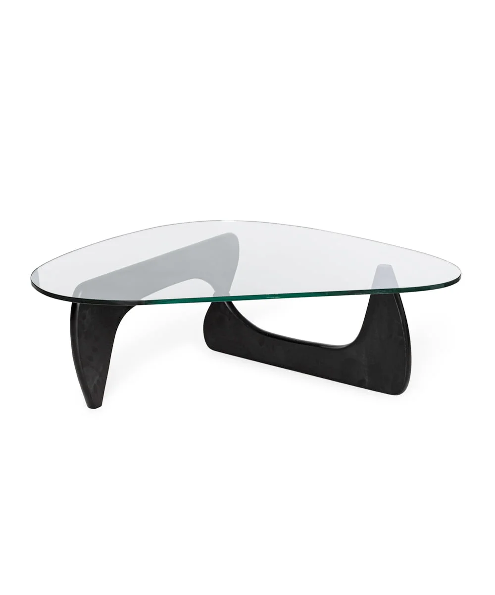 שולחן מעצבים, טופ זכוכית המונחת על רגל עץ מלא בצבע שחור.