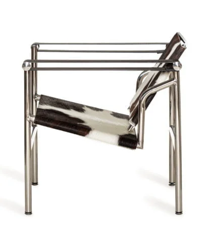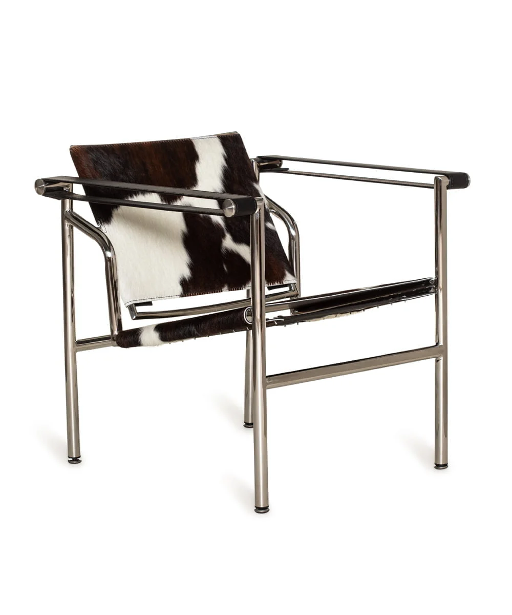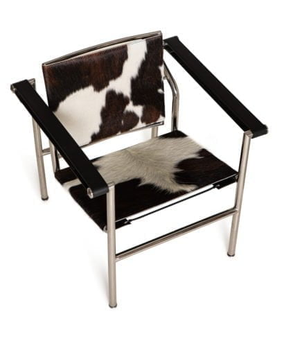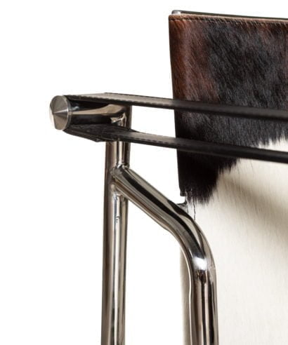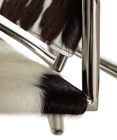 חומר גלם : מושב וגב הכורסא עור פרה אמיתי שחור+ לבן, גוף הכורסא ניקל כסוף.
