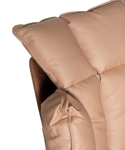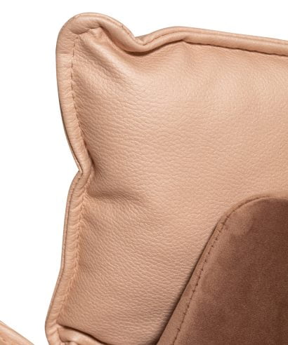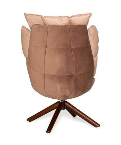 חומר גלם : רגלי הכורסא עשויים עץ מלא בצבע אגוז כהה, גוף הכורסא עשויים בד בגוון נס קפה, כרית הכורסא עשויה בד בגוון ורוד שמפניה. הכורסא מסתובבת 360 מעלות.