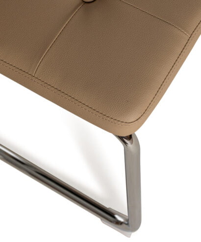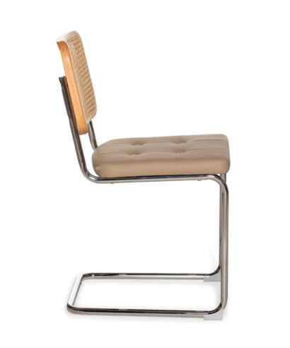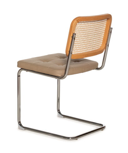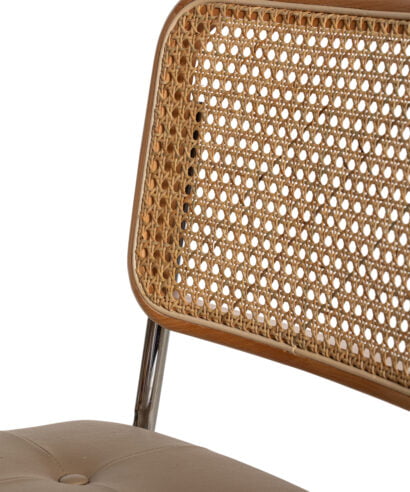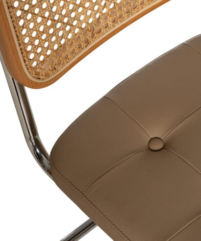 כסא משלב גוף ברזל ניקל, גב ראטן איכותי במיוחד ומושב דמוי עור בצבע קפה.
