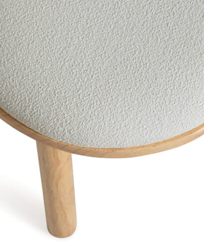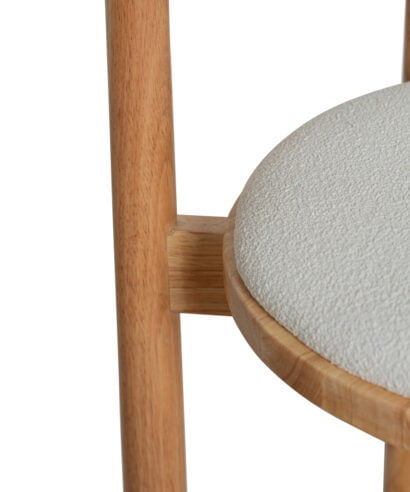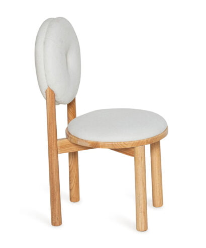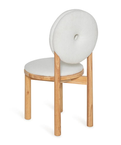 כסא מודרני בשילוב עץ מלא בגוון טבעי עם בד צמר בוקלה לבן.