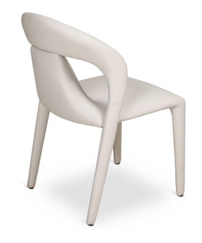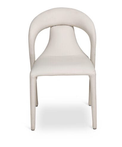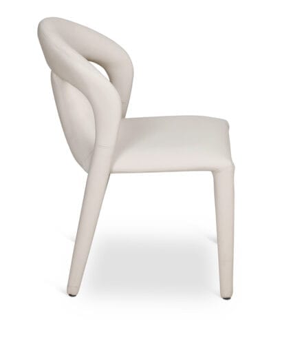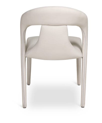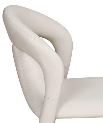 כיסא בעיצוב עכשווי עם קווים רכים וזורמים, מרופד כולו בדמוי עור בגוון בז’ בהיר. גב הכיסא המעוגל משתלב במשענת ידיים אינטגרלית ליצירת צורה ייחודית ונוחות מרבית. הבחירה המושלמת לפינות אוכל יוקרתיות או לחללי אירוח מודרניים.