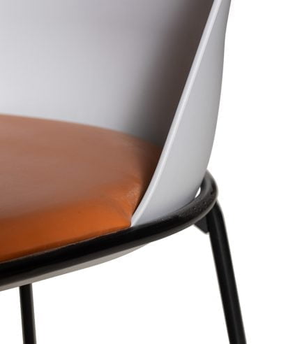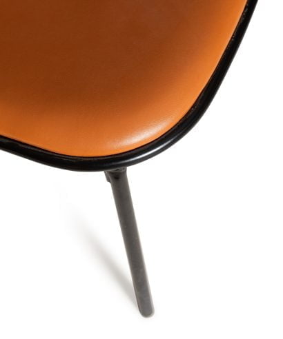 חומר גלם : גוף הכסא עשוי מטאל בצבע שחור, בשילוב מושב דמוי עור בצבע חום כרמל, גב המושב עשוי פלסטיק יצוק בצבע אפור בהיר.