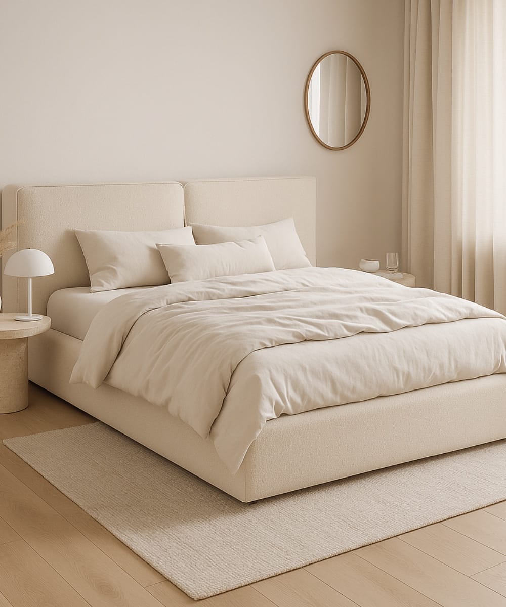 מיטה מרופדת בקווים נקיים ומינימליסטיים, בעלת ראש מיטה כפול ורחב המעניק תחושת עומק ורכות לחלל השינה. הריפוד עשוי בד איכותי במרקם חלק ונעים למגע, בגוון שמנת טבעי המשתלב בקלות עם כל סגנון עיצוב — סקנדינבי, מודרני או קלאסי.
