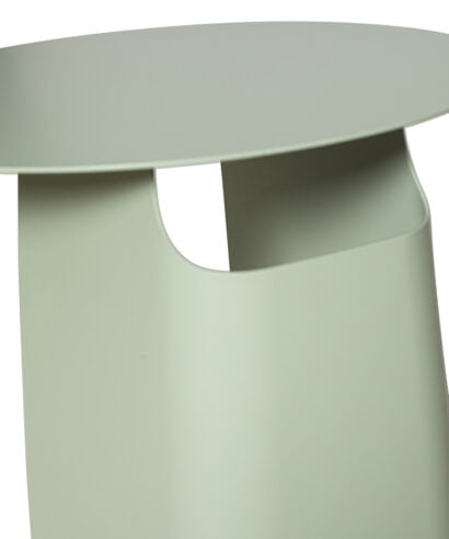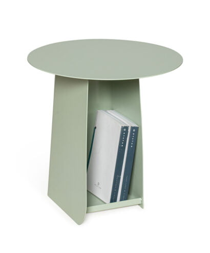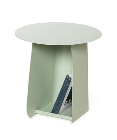 שולחן צד עשוי ברזל מוחלק בגוון ירוק אגס, מוצר מעוצב הכולל נישה למגזינים וספרים, ניתן לשימוש כשולחן צד פינתי או שולחן צד מיטה.