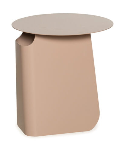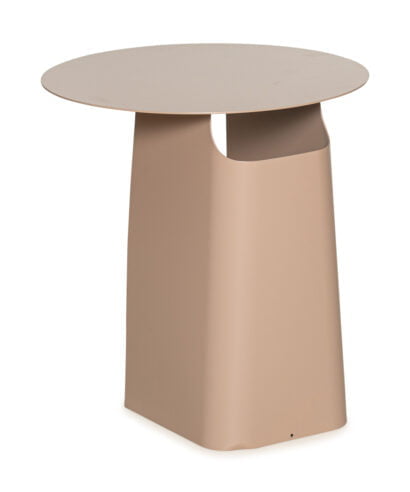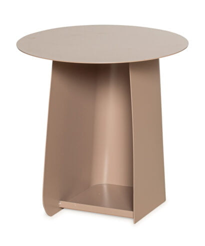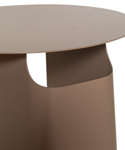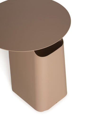שולחן צד עשוי ברזל מוחלק בגוון קפה, מוצר מעוצב הכולל נישה למגזינים וספרים, ניתן לשימוש כשולחן צד פינתי או שולחן צד מיטה.