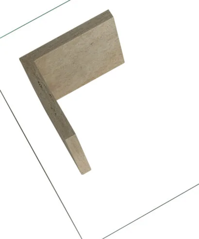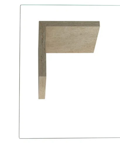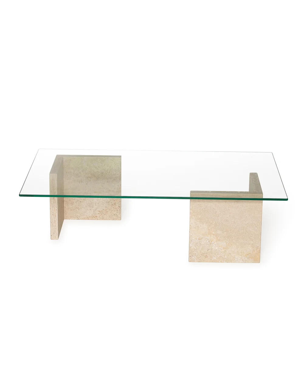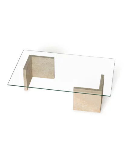 שולחן מעצבים, טופ זכוכית המונח על 2 רגלי שיש טרוורטין טבעי .