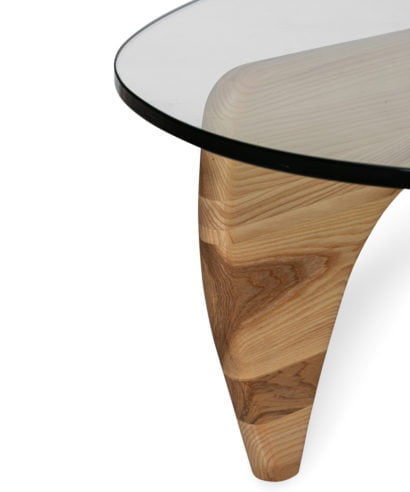 שולחן מעצבים, טופ זכוכית המונחת על רגל עץ מלא בגוון טבעי.