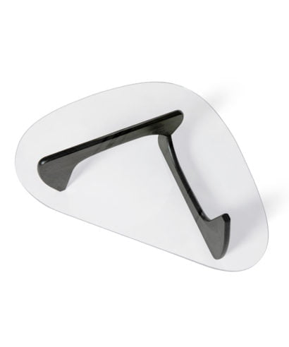 שולחן מעצבים, טופ זכוכית המונחת על רגל עץ מלא בצבע שחור.
