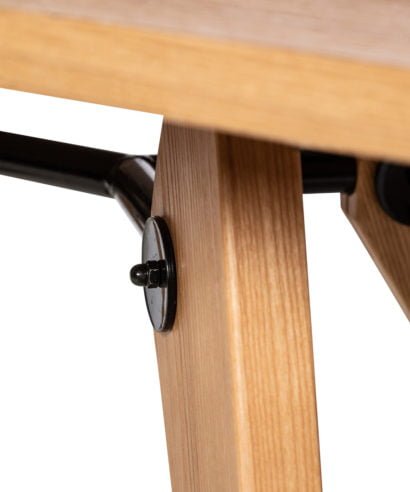 שולחן עץ מלא בגוון בהיר, חיבור דקורטיבי עשוי מטאל בצבע שחור.